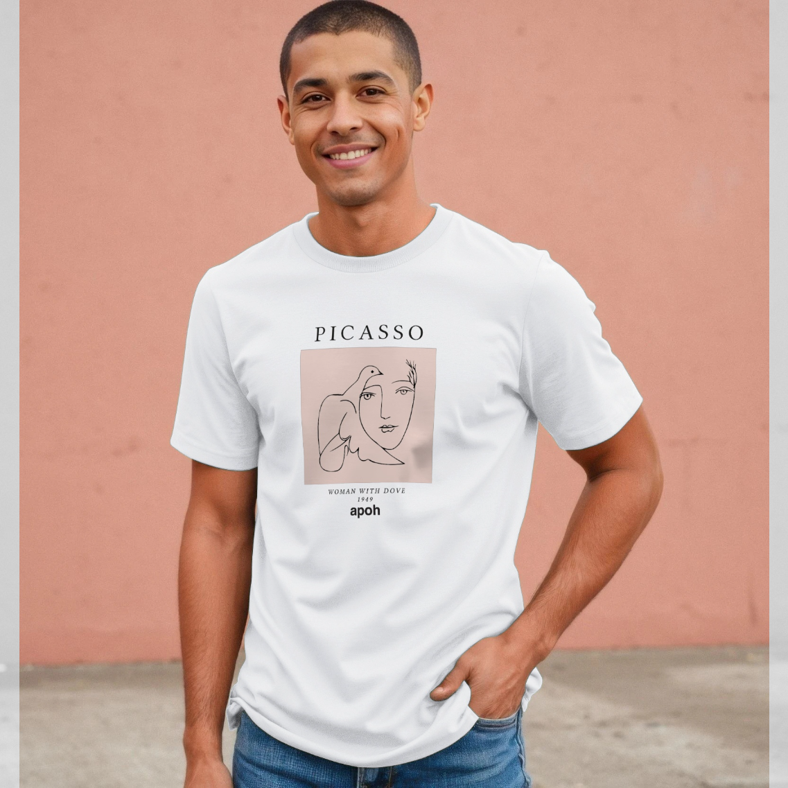 Our OFFICIAL Picasso Woman with Dove White T-Shirt based on the popular art collections features a printed design on the front. This quality garment is manufactured officially under license by Park London on behalf of APOH.
