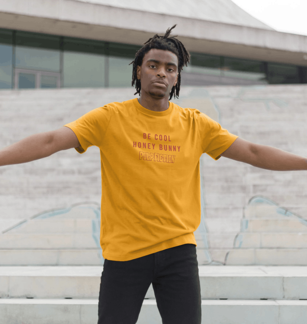 Our OFFICIAL Pulp Fiction Honey Bunny Gold Unisex T-Shirt based on the popular film features a printed design on the front. This quality garment is manufactured officially under license by Park London on behalf of Pulp Fiction.
