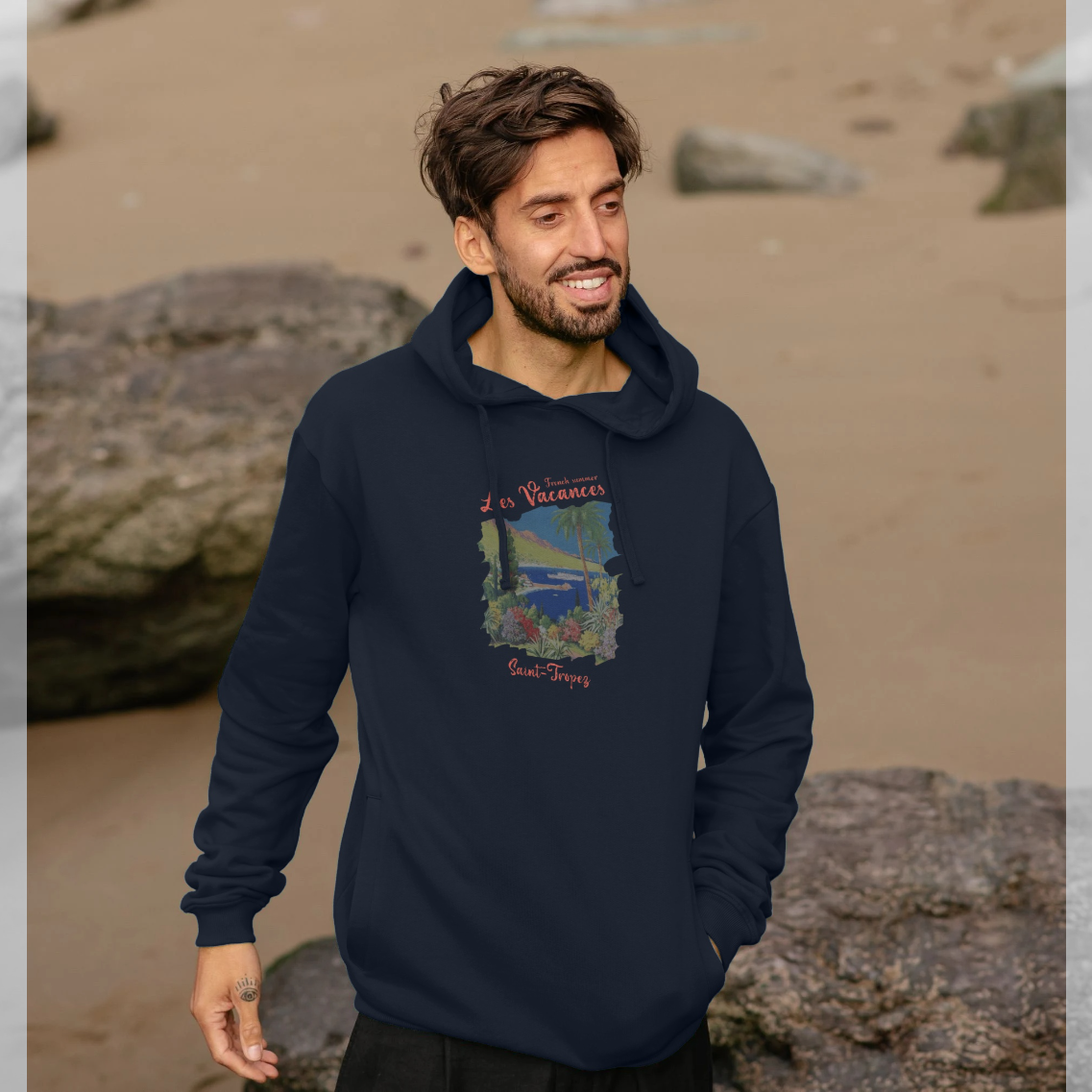 Our OFFICIAL Saint Tropez Vacances Graphic Print Navy Blue Hoodie based on the popular art collections features a printed design on the front. This quality garment is manufactured officially under license by Park London on behalf of apoh.