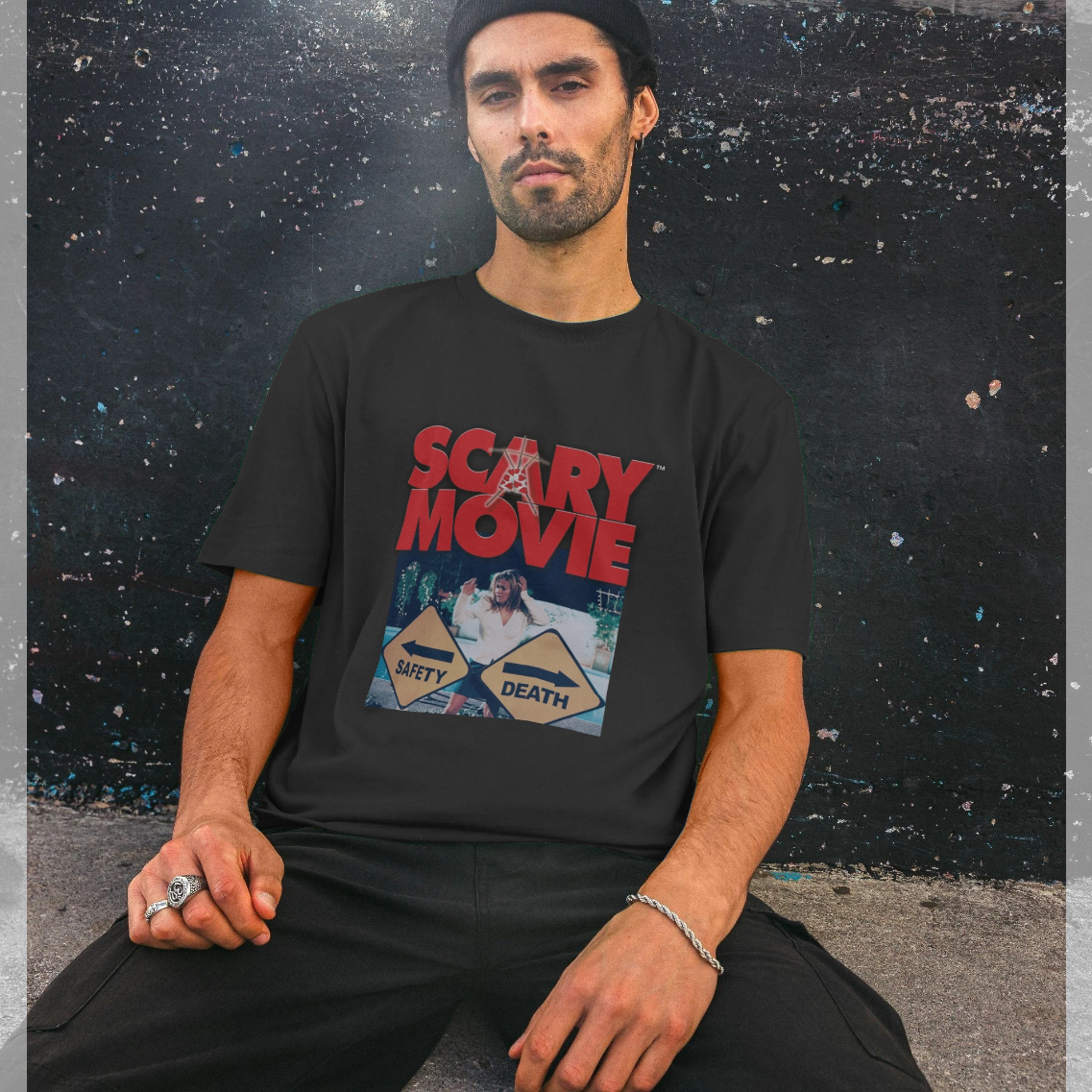 Our OFFICIAL Scary Movie Official Safety vs Death Graphic Black T-Shirt based on the popular film features a printed design on the front. This quality garment is manufactured officially under license by Park London on behalf of Scary Movie.