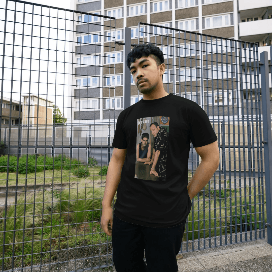 Our OFFICIAL The Sopranos Tony & Christopher Black T-Shirt based on the popular TV series features a printed design on the front. This quality garment is manufactured officially under license by Park London on behalf of The Sopranos.
