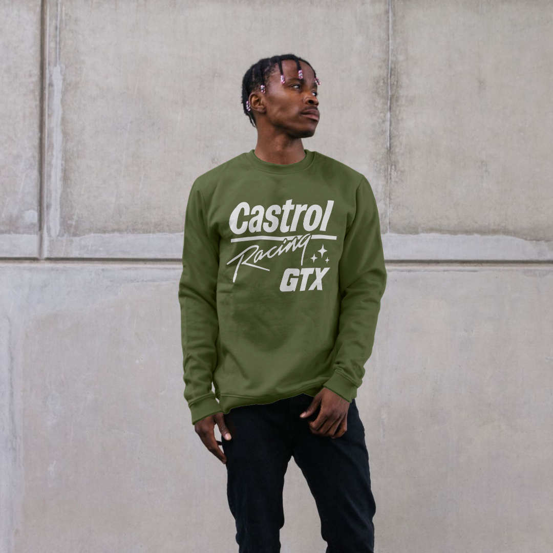 Our OFFICIAL Castrol Racing GTX Sweatshirt Khaki based on the popular Castrol branded features a printed design on the front. This quality garment is manufactured officially under license by Park London on behalf of Castrol.