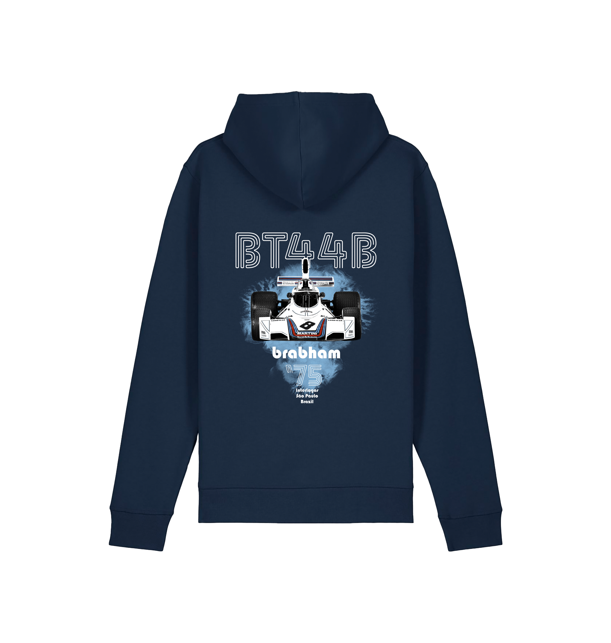 This design features the iconic BT44B Formula One racing car designed by Gordon Murray, Brabham's chief designer. Regarded as one of the most beautiful Formula One cars of all time. Unisex Fit. This hoodie features a print on the chest and back.