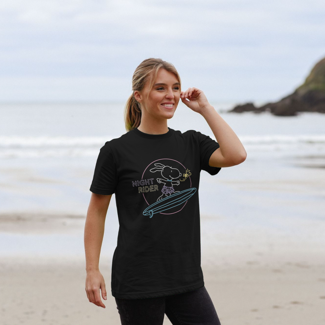 Peanuts Snoopy Neon Night Rider Surf Retro Black T-Shirt