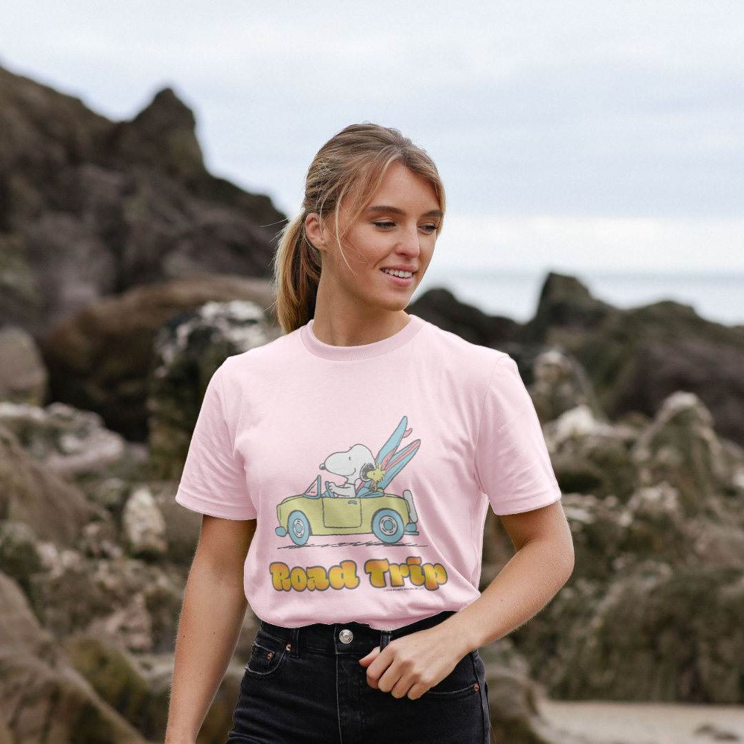 Peanuts Snoopy Woodstock Road Trip Summer Adventure Retro Pink T-Shirt