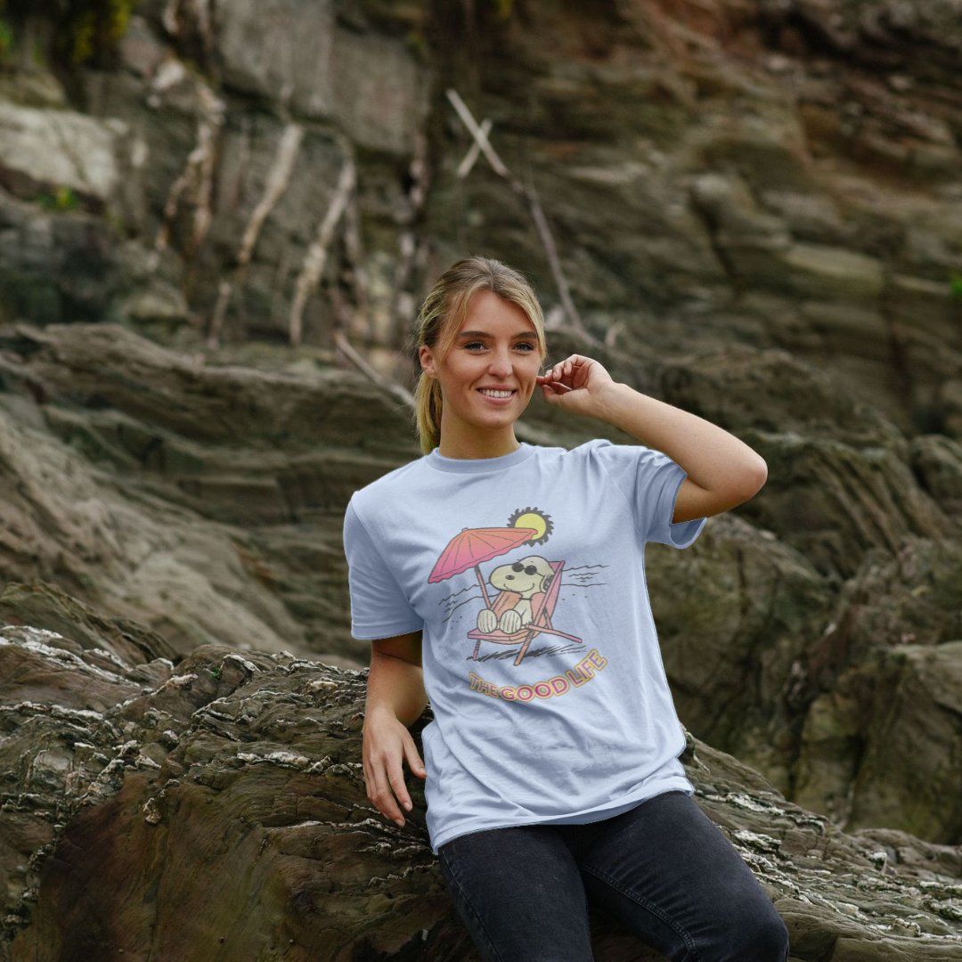 Peanuts Snoopy Good Life Beach Holiday Summer Vibes Retro Sky Blue T-Shirt