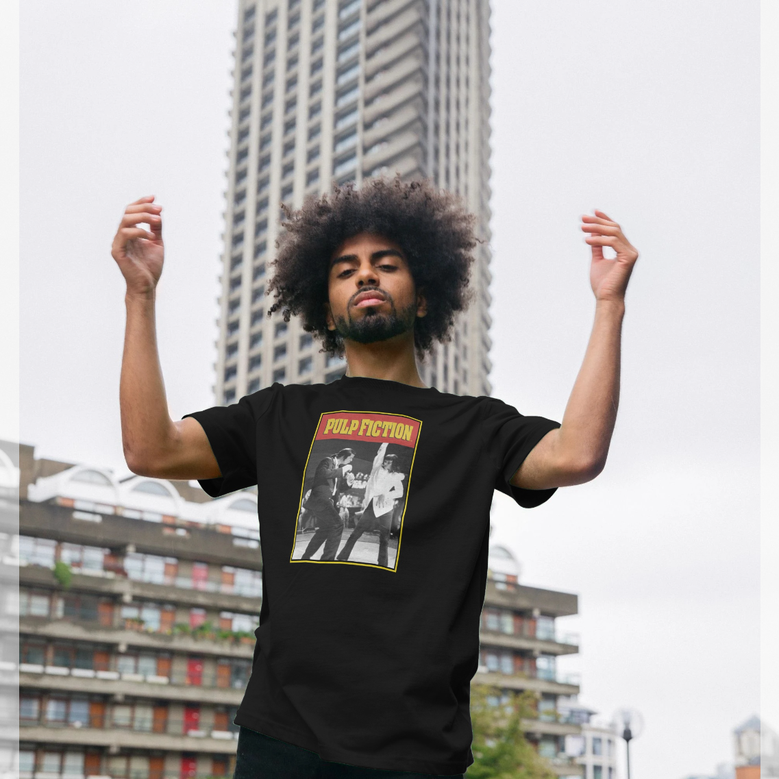Our OFFICIAL Pulp Fiction Dance Portrait Black Unisex T-Shirt based on the popular film features a printed design on the front. This quality garment is manufactured officially under license by Park London on behalf of Pulp Fiction.