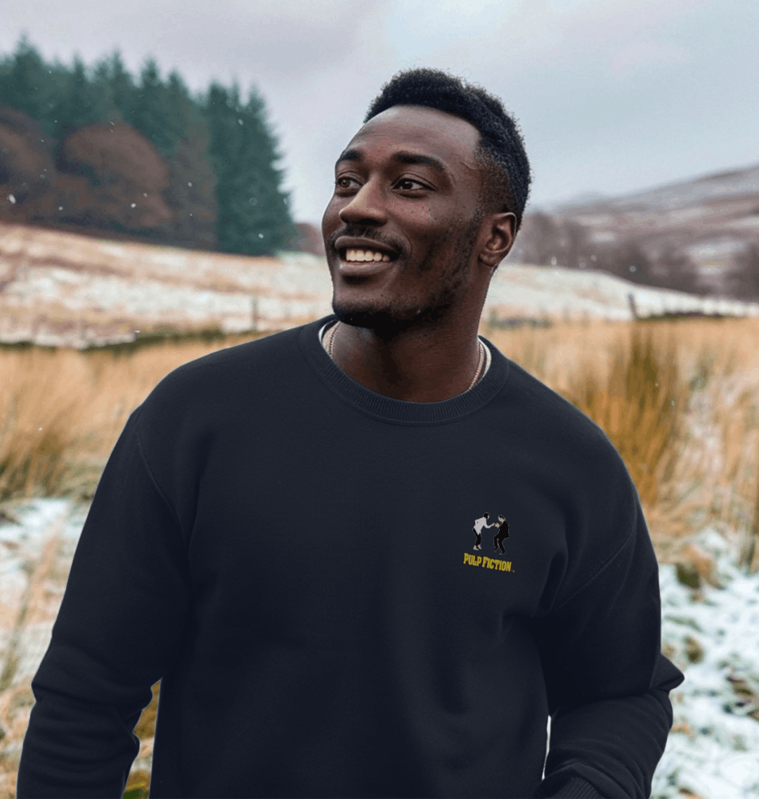 Our OFFICIAL Pulp Fiction Vince & Mia Navy Unisex Sweatshirt based on the popular film features a printed design on the front. This quality garment is manufactured officially under license by Park London on behalf of Pulp Fiction.