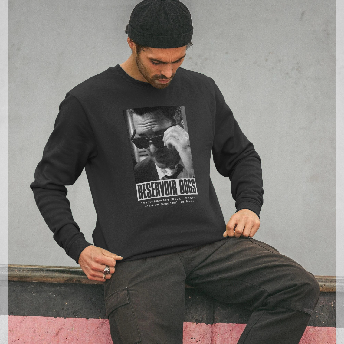 Our OFFICIAL Reservoir Dogs Mr Blonde 'Little Doggie' Quote Black Sweatshirt based on the popular film features a printed design on the front. This quality garment is manufactured officially under license by Park London on behalf of Reservoir Dogs.